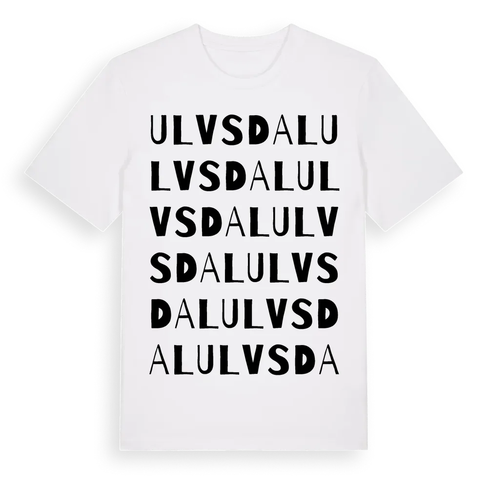 Ulvsdal ordlek t-shirt är inspirerad av byn Ulvsdal i Kalmar län, Sverige. Tröjan är designad för dig som har en speciell koppling till platsen – oavsett om du bor här, har rötterna här eller bara älskar Ulvsdal.