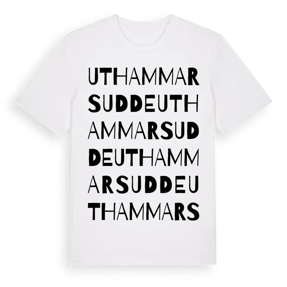 Uthammars Udde ordlek t-shirt är inspirerad av byn Uthammars Udde i Kalmar län, Sverige. Tröjan är designad för dig som har en speciell koppling till platsen – oavsett om du bor här, har rötterna här eller bara älskar Uthammars Udde.