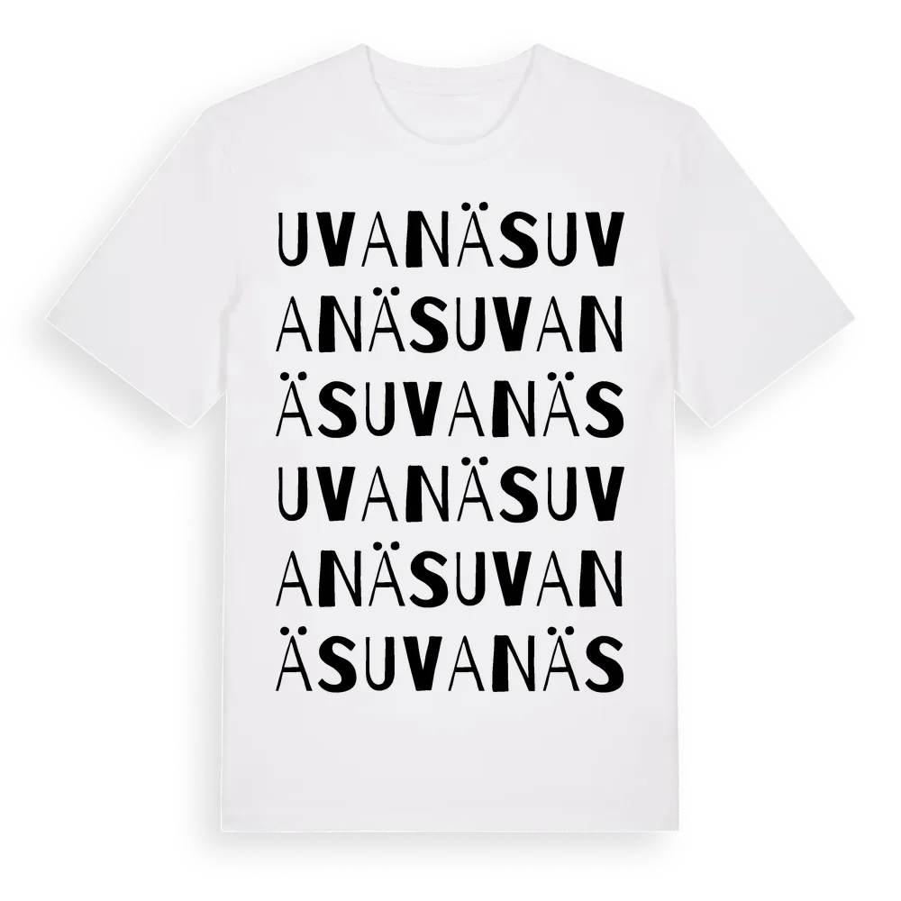 Uvanäs ordlek t-shirt är inspirerad av Uvanäs i Kalmar län, Sverige. Tröjan är designad för dig som har en speciell koppling till platsen – oavsett om du bor här, har rötterna här eller bara älskar Uvanäs.