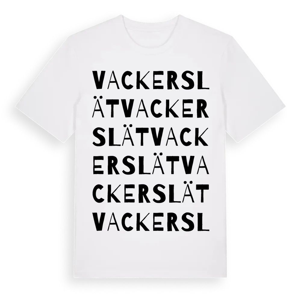 Vackerslät ordlek t-shirt är inspirerad av Vackerslät i Kalmar län, Sverige. Tröjan är designad för dig som har en speciell koppling till platsen – oavsett om du bor här, har rötterna här eller bara älskar Vackerslät.