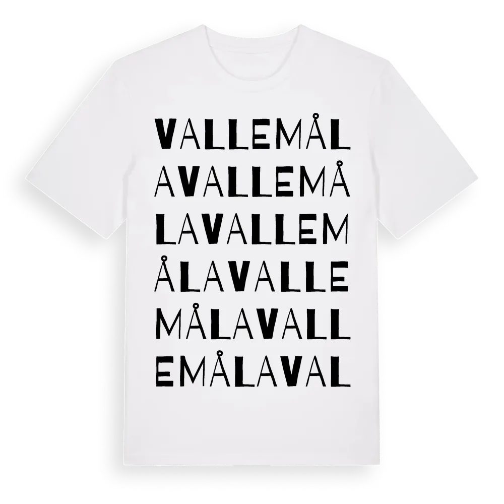 Vallemåla ordlek t-shirt är inspirerad av byn Vallemåla i Kalmar län, Sverige. Tröjan är designad för dig som har en speciell koppling till platsen – oavsett om du bor här, har rötterna här eller bara älskar Vallemåla.