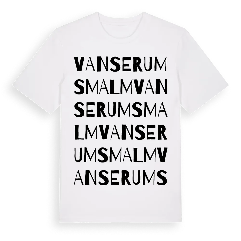 Vanserums Malm ordlek t-shirt är inspirerad av byn Vanserums Malm i Kalmar län, Sverige. Tröjan är designad för dig som har en speciell koppling till platsen – oavsett om du bor här, har rötterna här eller bara älskar Vanserums Malm.