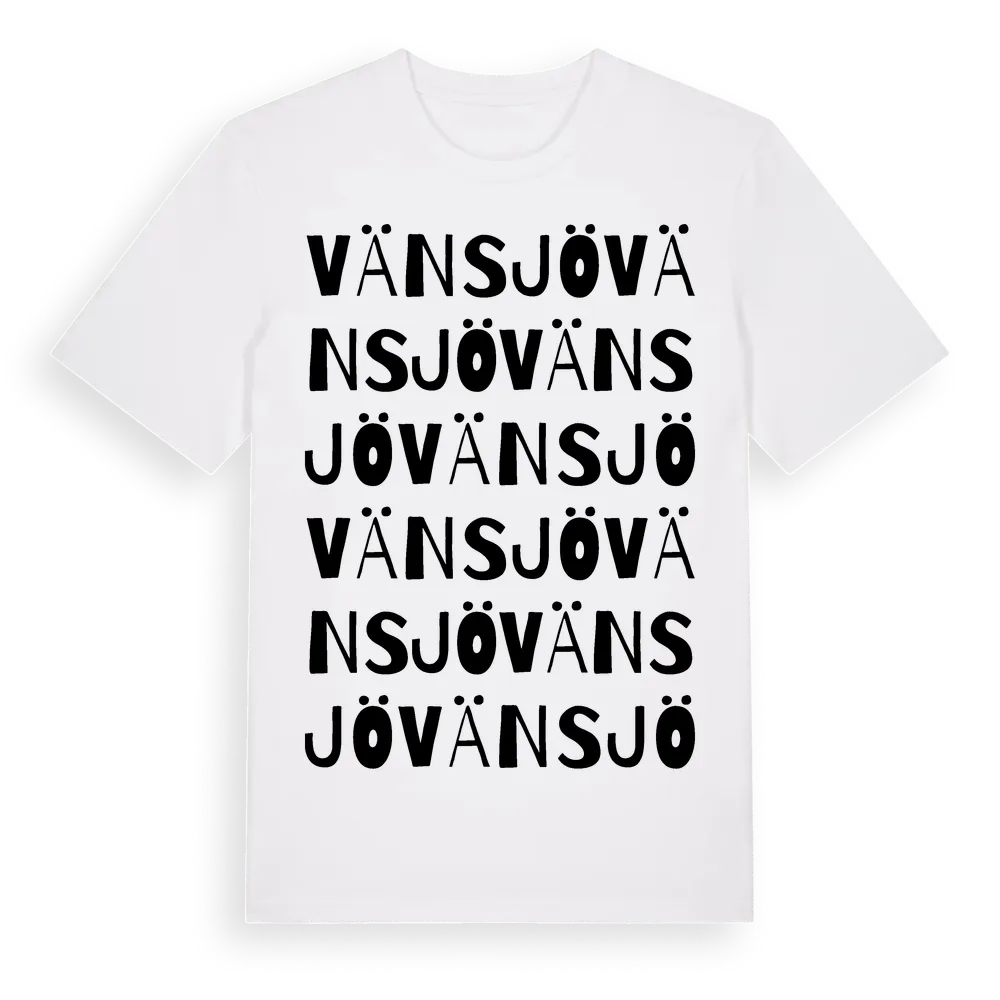 Vänsjö ordlek t-shirt är inspirerad av byn Vänsjö i Kalmar län, Sverige. Tröjan är designad för dig som har en speciell koppling till platsen – oavsett om du bor här, har rötterna här eller bara älskar Vänsjö.