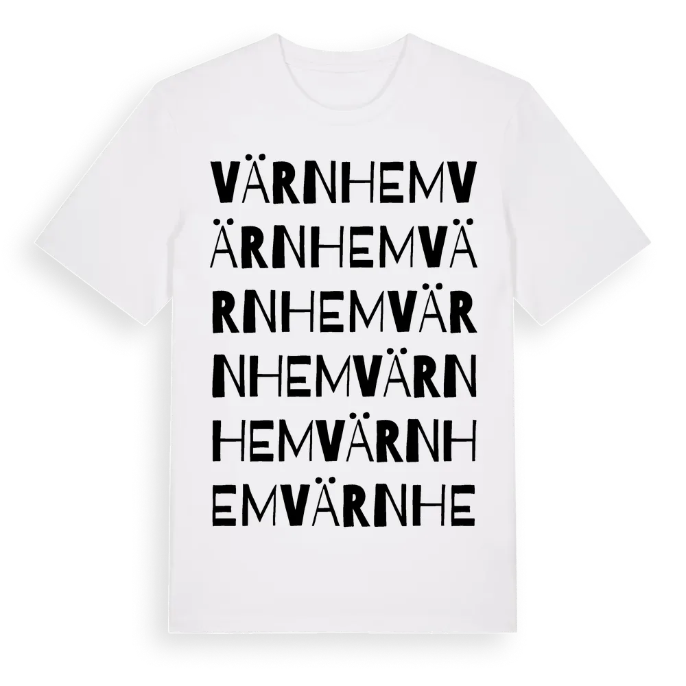 Värnhem ordlek t-shirt är inspirerad av Värnhem i Kalmar län, Sverige. Tröjan är designad för dig som har en speciell koppling till platsen – oavsett om du bor här, har rötterna här eller bara älskar Värnhem.