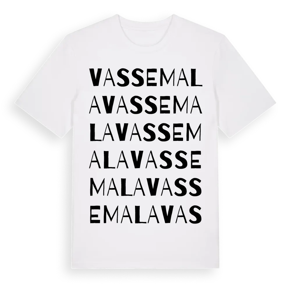 Vassemala ordlek t-shirt är inspirerad av byn Vassemala i Kalmar län, Sverige. Tröjan är designad för dig som har en speciell koppling till platsen – oavsett om du bor här, har rötterna här eller bara älskar Vassemala.