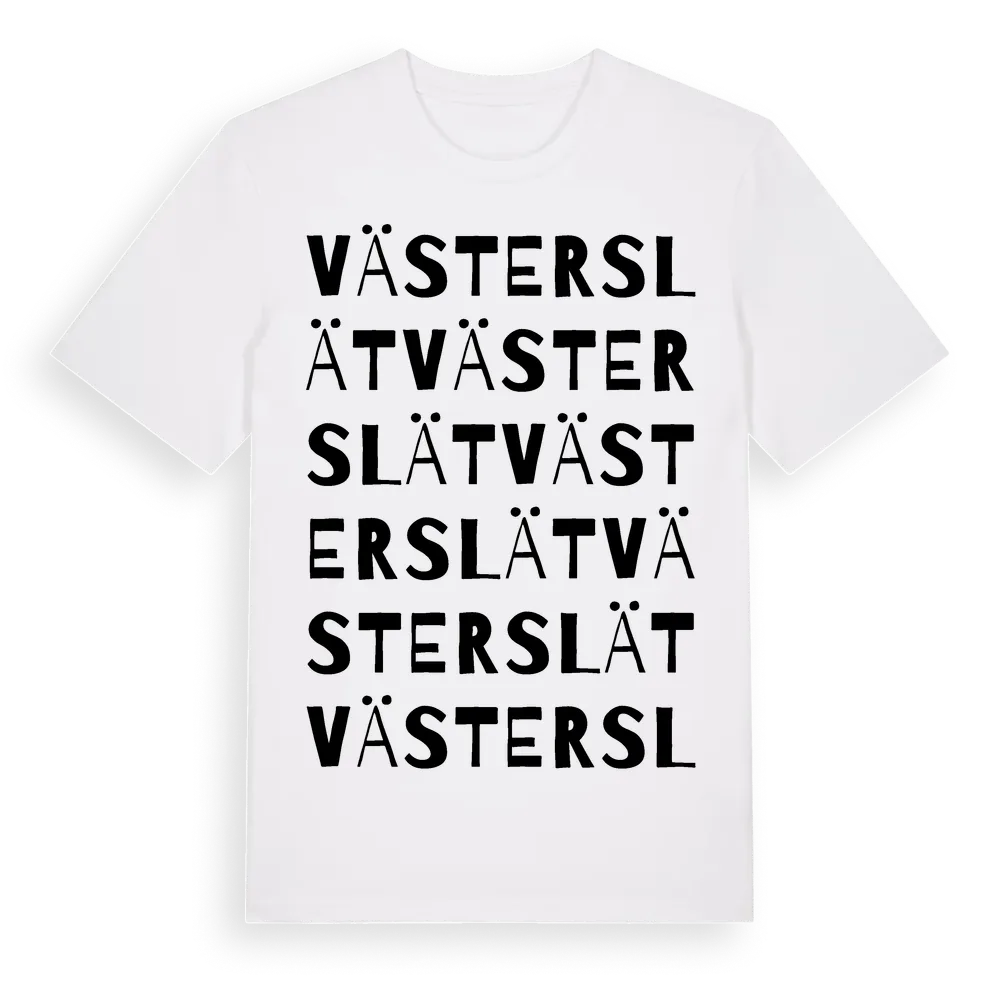 Västerslät ordlek t-shirt är inspirerad av Västerslät i Kalmar län, Sverige. Tröjan är designad för dig som har en speciell koppling till platsen – oavsett om du bor här, har rötterna här eller bara älskar Västerslät.