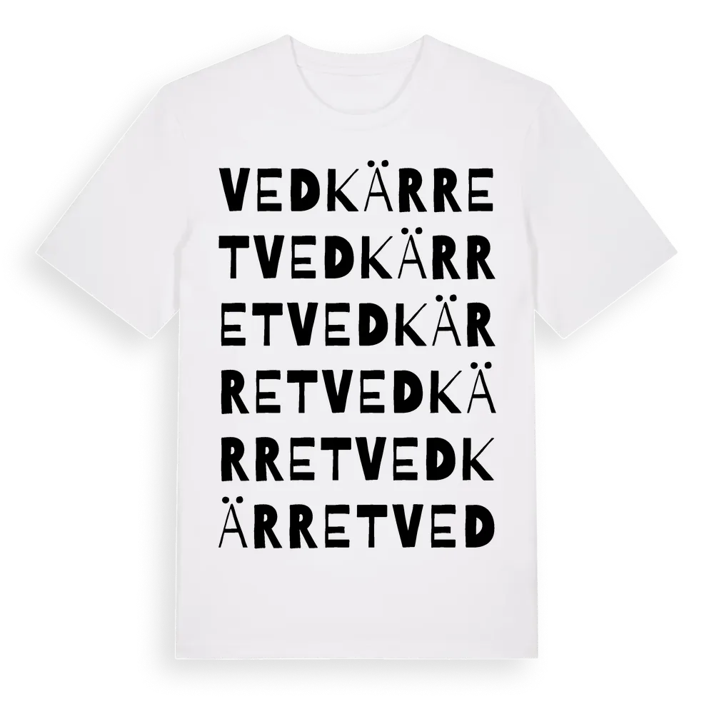 Vedkärret ordlek t-shirt är inspirerad av Vedkärret i Kalmar län, Sverige. Tröjan är designad för dig som har en speciell koppling till platsen – oavsett om du bor här, har rötterna här eller bara älskar Vedkärret.