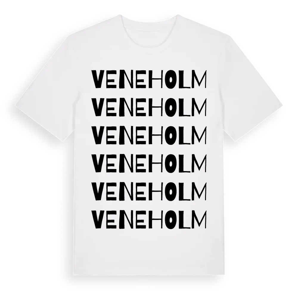 Veneholm ordlek t-shirt är inspirerad av Veneholm i Kalmar län, Sverige. Tröjan är designad för dig som har en speciell koppling till platsen – oavsett om du bor här, har rötterna här eller bara älskar Veneholm.