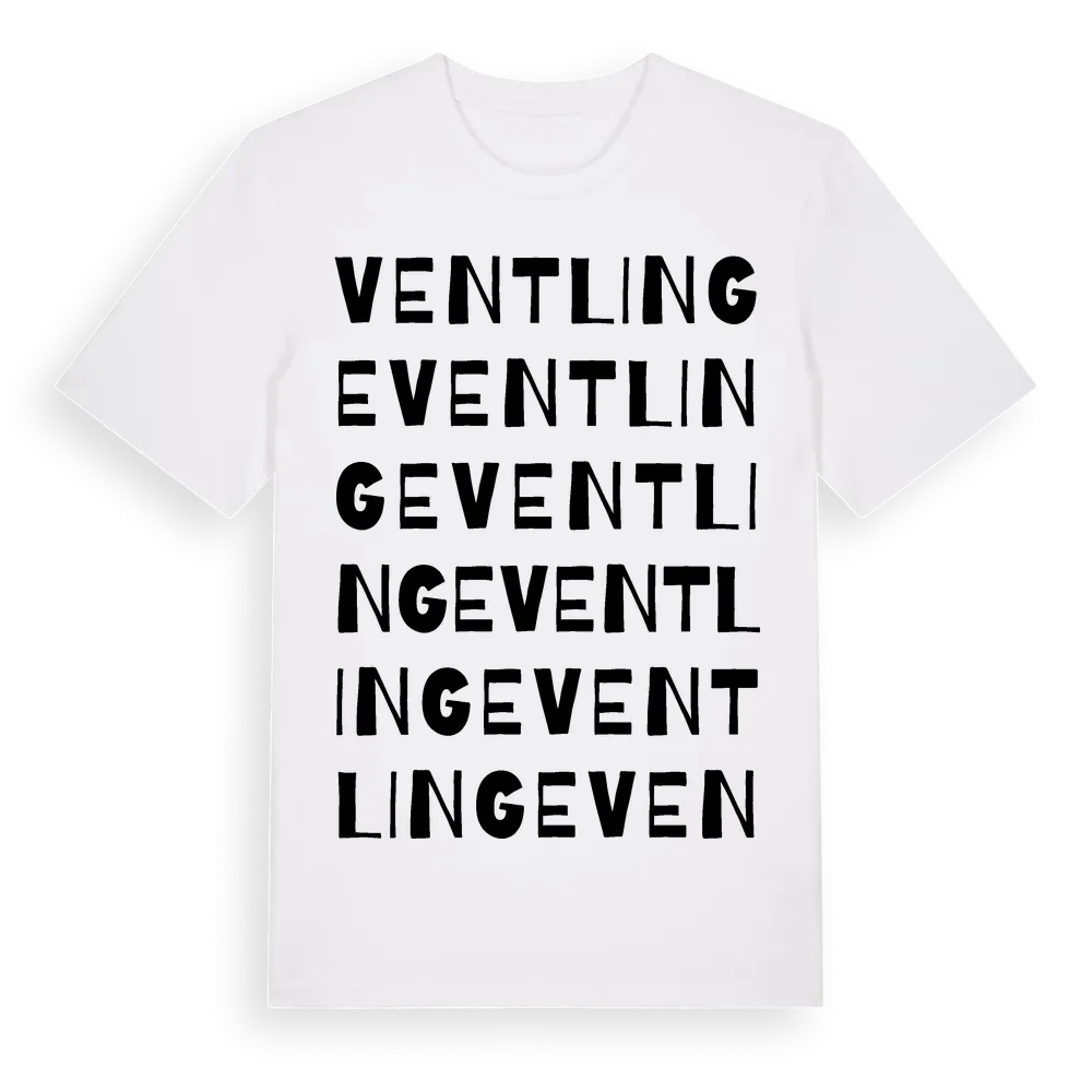 Ventlinge ordlek t-shirt är inspirerad av byn Ventlinge i Kalmar län, Sverige. Tröjan är designad för dig som har en speciell koppling till platsen – oavsett om du bor här, har rötterna här eller bara älskar Ventlinge.