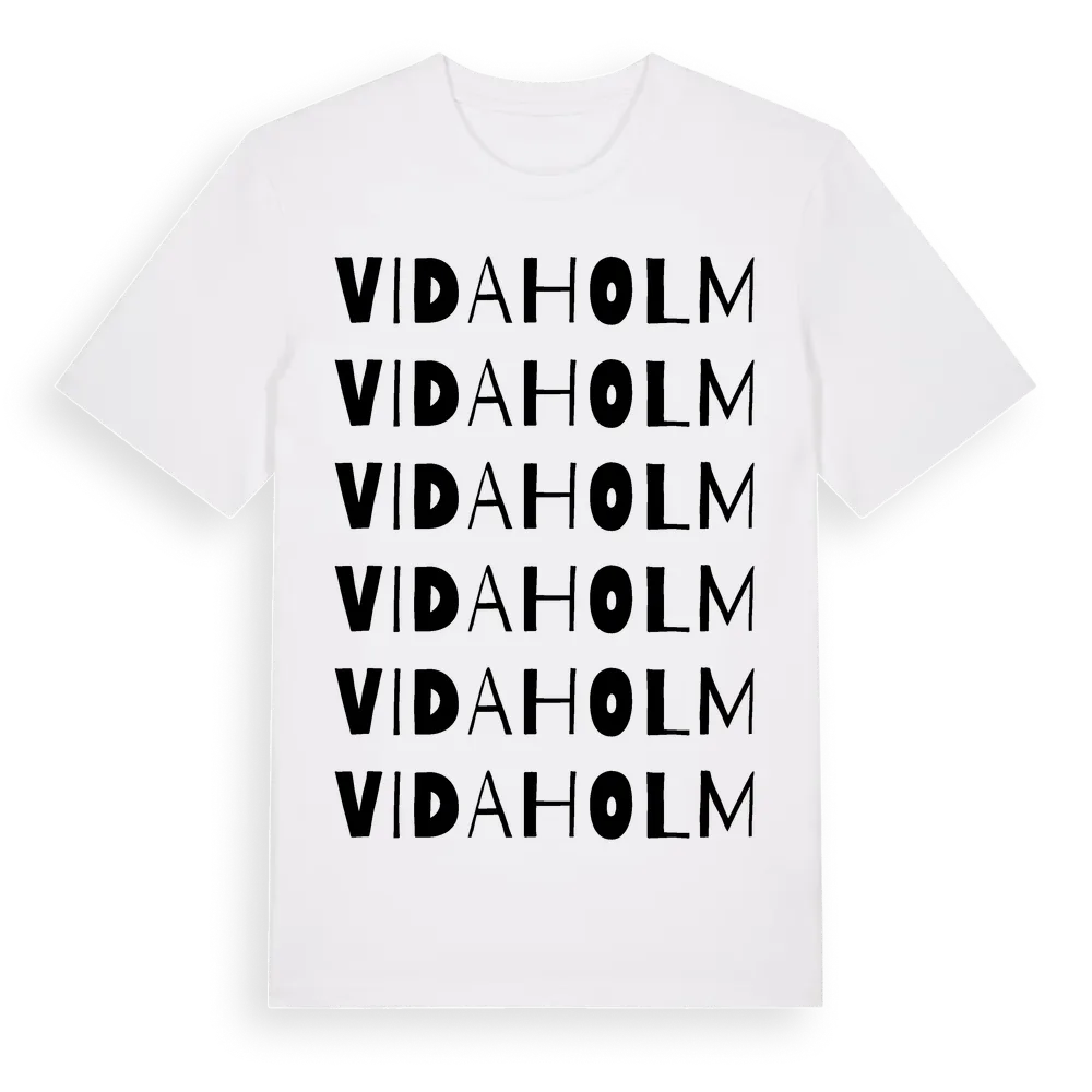 En ordlek byggd på Vidaholms namn. Subtilt och klurig – ett motiv som bara de som verkligen känner platsen fullt ut förstår. Premium bomull, unisex – från Vidaholm i Kalmar län.