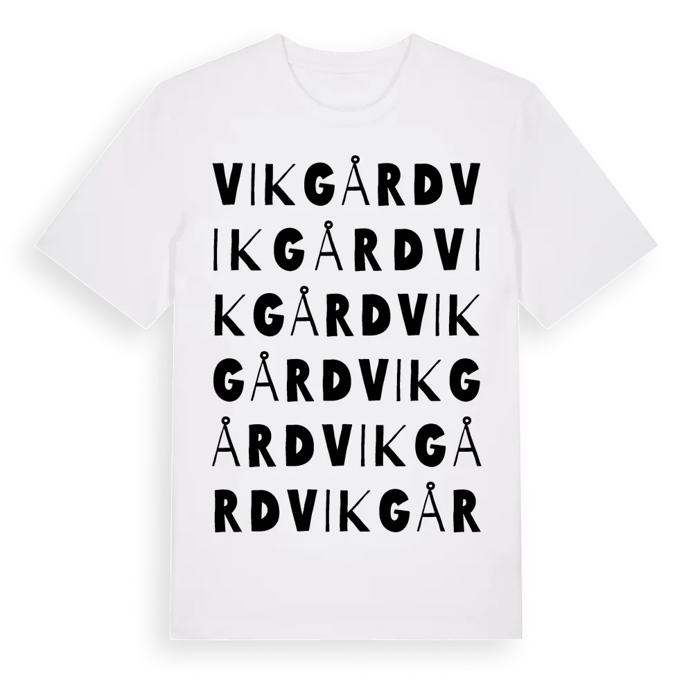 Vikgård ordlek t-shirt är inspirerad av Vikgård i Kalmar län, Sverige. Tröjan är designad för dig som har en speciell koppling till platsen – oavsett om du bor här, har rötterna här eller bara älskar Vikgård.