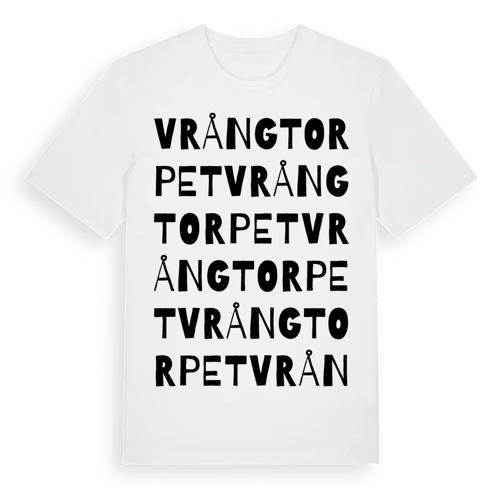 Vrångtorpet ordlek t-shirt är inspirerad av Vrångtorpet i Kalmar län, Sverige. Tröjan är designad för dig som har en speciell koppling till platsen – oavsett om du bor här, har rötterna här eller bara älskar Vrångtorpet.