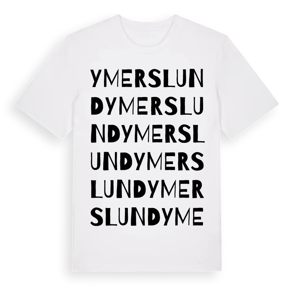 Ymerslund ordlek t-shirt är inspirerad av Ymerslund i Kalmar län, Sverige. Tröjan är designad för dig som har en speciell koppling till platsen – oavsett om du bor här, har rötterna här eller bara älskar Ymerslund.