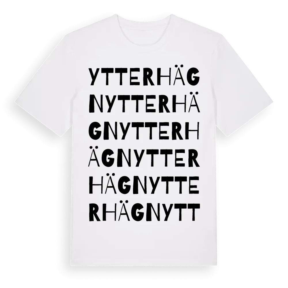 Ytterhägn ordlek t-shirt är inspirerad av Ytterhägn i Kalmar län, Sverige. Tröjan är designad för dig som har en speciell koppling till platsen – oavsett om du bor här, har rötterna här eller bara älskar Ytterhägn.