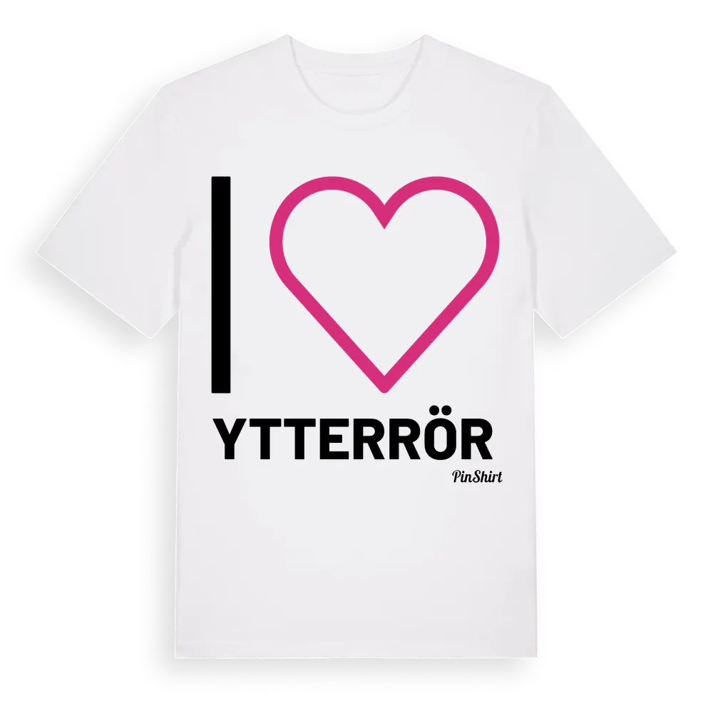 Jag älskar Ytterrör t-shirt stort tryck är inspirerad av byn Ytterrör i Kalmar län, Sverige. Tröjan är designad för dig som har en speciell koppling till platsen – oavsett om du bor här, har rötterna här eller bara älskar Ytterrör.