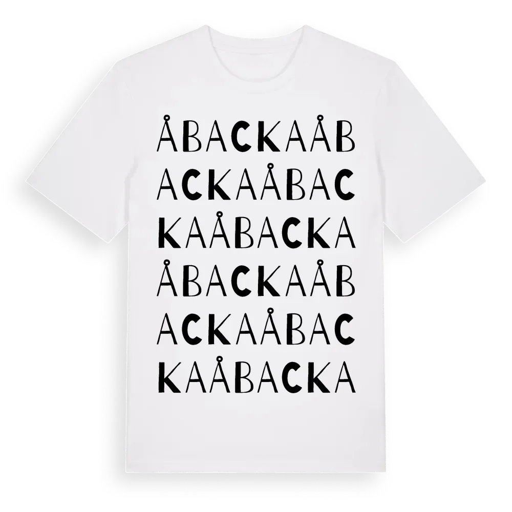 Åbacka ordlek t-shirt är inspirerad av Åbacka i Kronobergs län, Sverige. Tröjan är designad för dig som har en speciell koppling till platsen – oavsett om du bor här, har rötterna här eller bara älskar Åbacka.