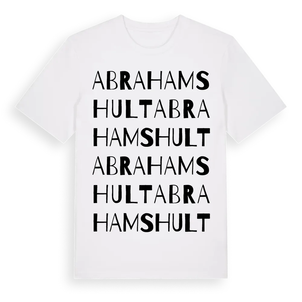 Abrahamshult ordlek t-shirt är inspirerad av byn Abrahamshult i Kronobergs län, Sverige. Tröjan är designad för dig som har en speciell koppling till platsen – oavsett om du bor här, har rötterna här eller bara älskar Abrahamshult.