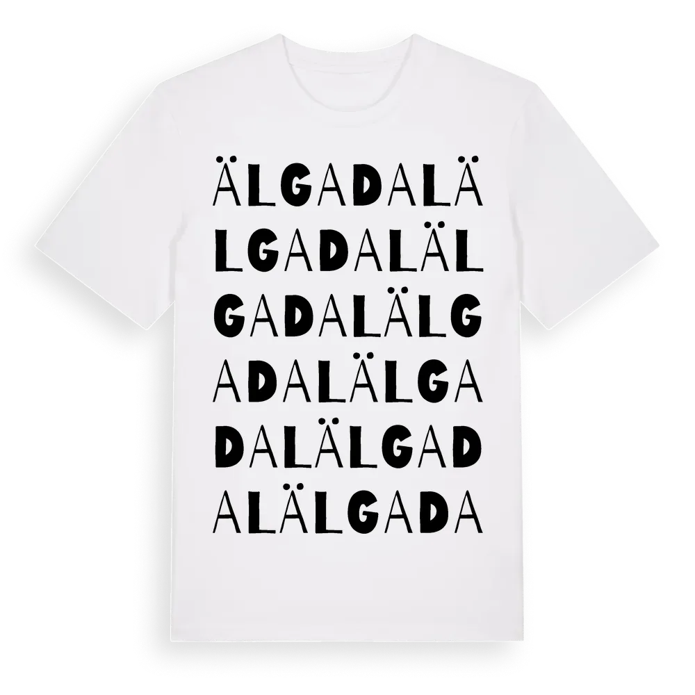 Älgadal ordlek t-shirt är inspirerad av Älgadal i Kronobergs län, Sverige. Tröjan är designad för dig som har en speciell koppling till platsen – oavsett om du bor här, har rötterna här eller bara älskar Älgadal.