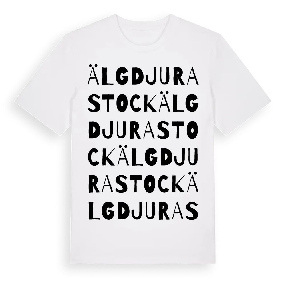Älgdjurastock ordlek t-shirt är inspirerad av byn Älgdjurastock i Kronobergs län, Sverige. Tröjan är designad för dig som har en speciell koppling till platsen – oavsett om du bor här, har rötterna här eller bara älskar Älgdjurastock.