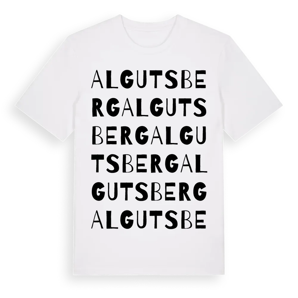 Algutsberg ordlek t-shirt är inspirerad av Algutsberg i Kronobergs län, Sverige. Tröjan är designad för dig som har en speciell koppling till platsen – oavsett om du bor här, har rötterna här eller bara älskar Algutsberg.