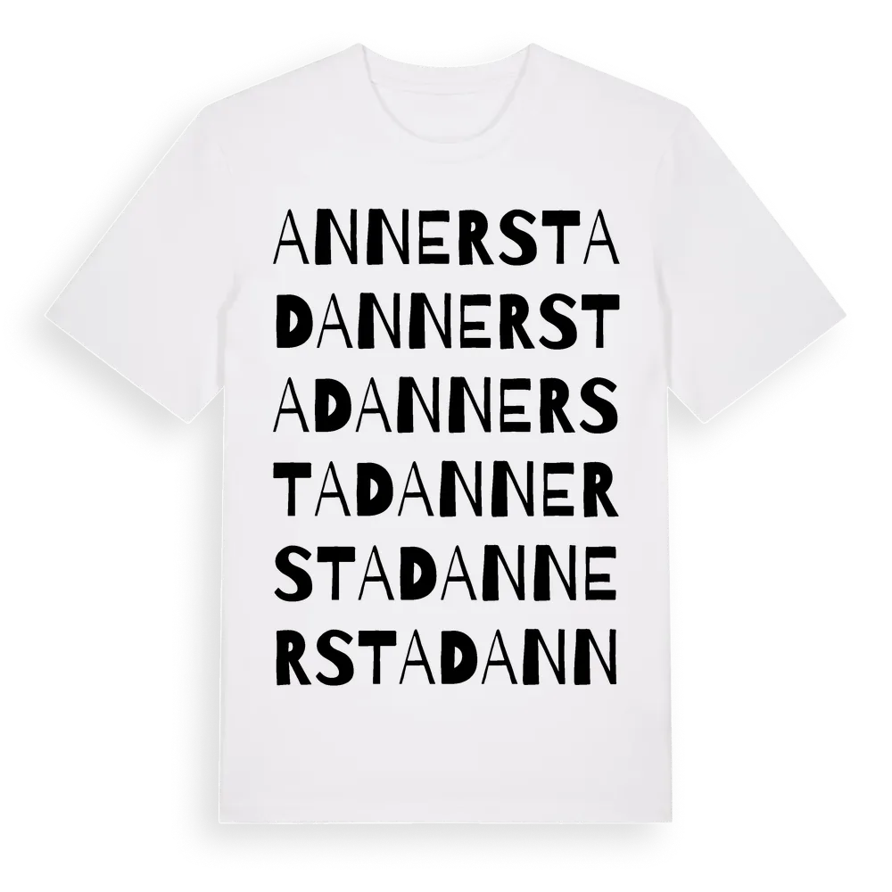 Annerstad ordlek t-shirt är inspirerad av byn Annerstad i Kronobergs län, Sverige. Tröjan är designad för dig som har en speciell koppling till platsen – oavsett om du bor här, har rötterna här eller bara älskar Annerstad.