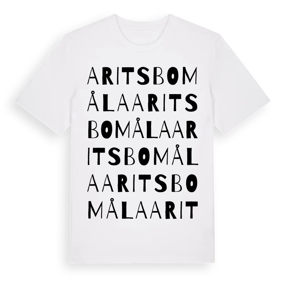 Aritsbomåla ordlek t-shirt är inspirerad av Aritsbomåla i Kronobergs län, Sverige. Tröjan är designad för dig som har en speciell koppling till platsen – oavsett om du bor här, har rötterna här eller bara älskar Aritsbomåla.