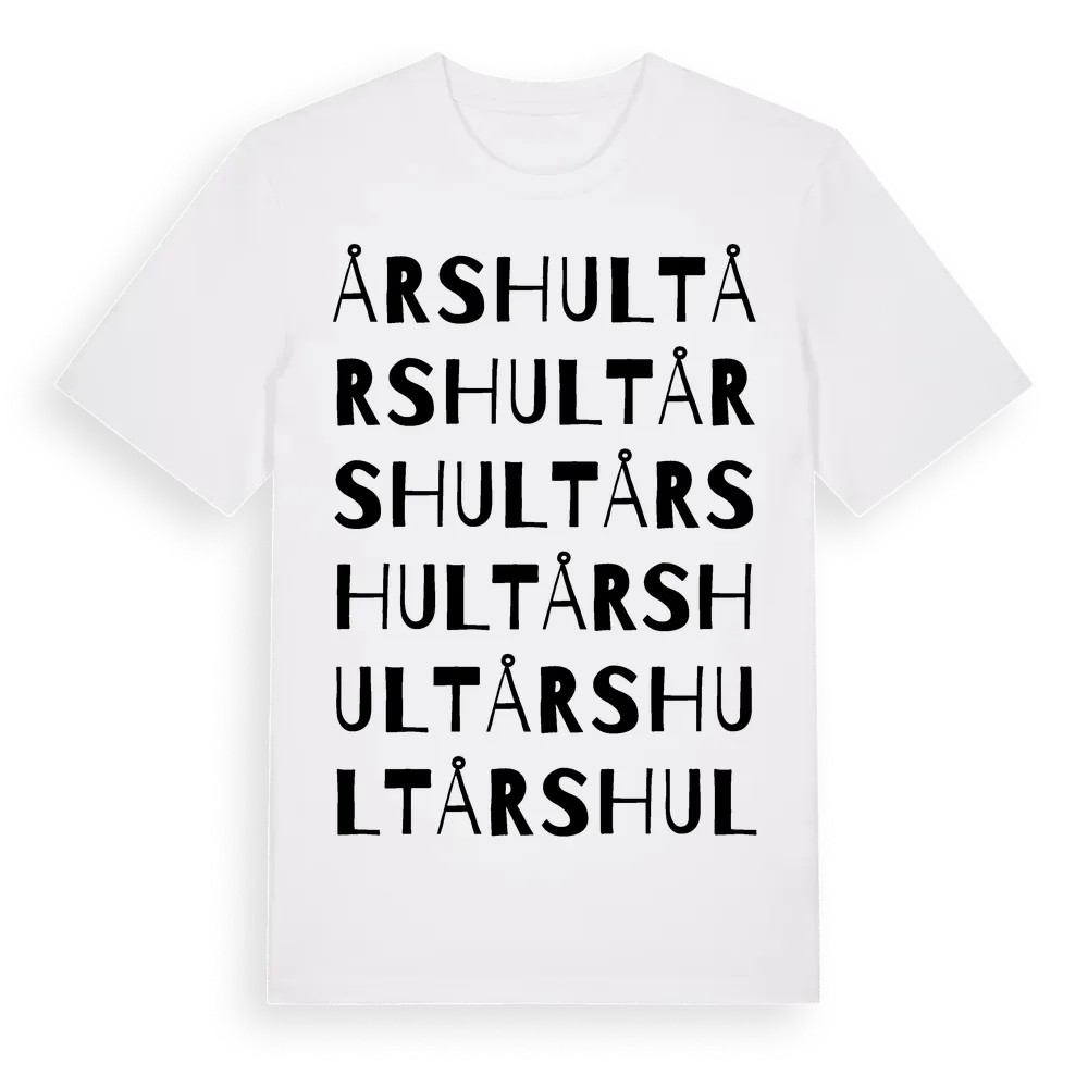 Årshult ordlek t-shirt är inspirerad av byn Årshult i Kronobergs län, Sverige. Tröjan är designad för dig som har en speciell koppling till platsen – oavsett om du bor här, har rötterna här eller bara älskar Årshult.