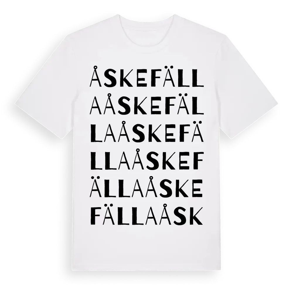 Åskefälla ordlek t-shirt är inspirerad av byn Åskefälla i Kronobergs län, Sverige. Tröjan är designad för dig som har en speciell koppling till platsen – oavsett om du bor här, har rötterna här eller bara älskar Åskefälla.