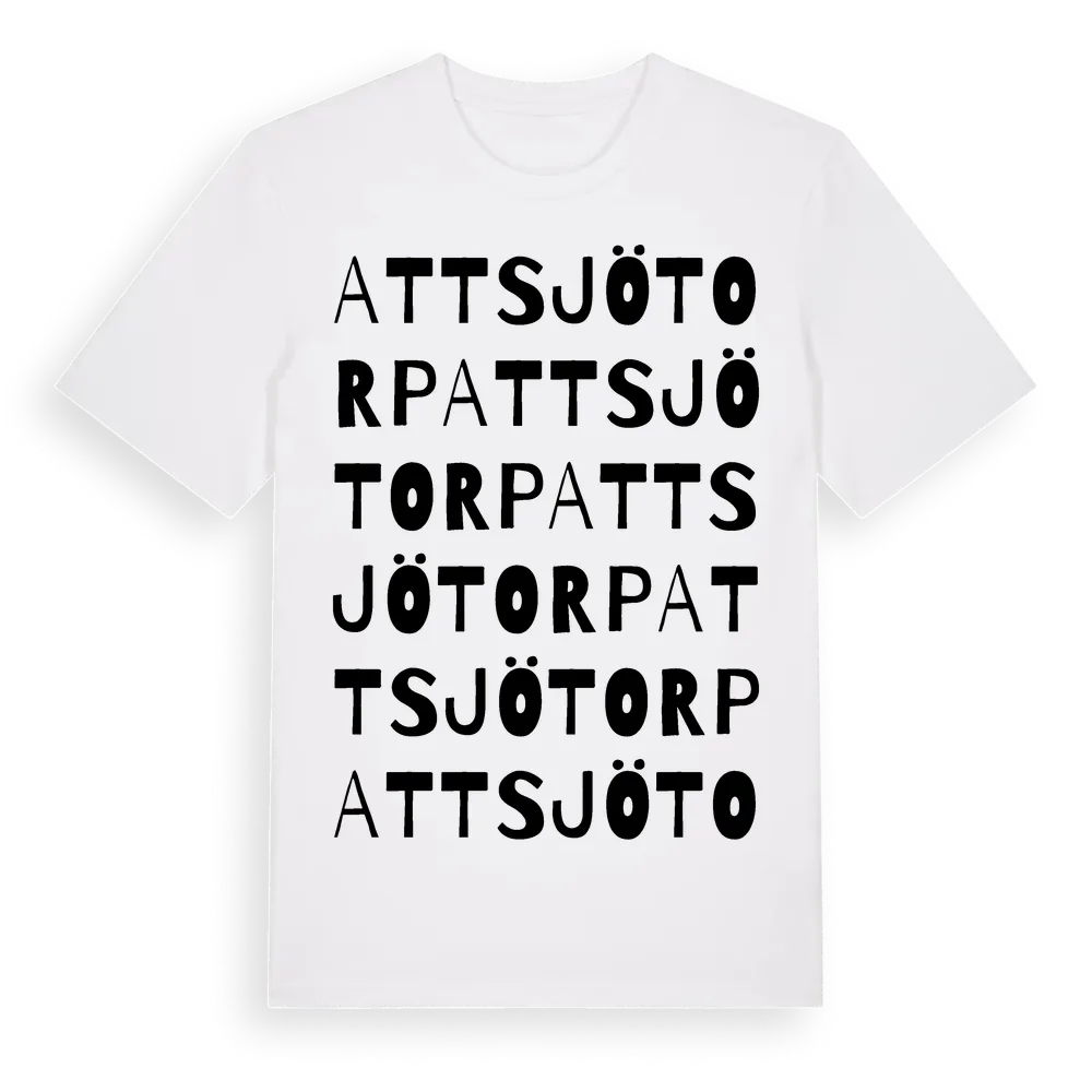 Attsjötorp ordlek t-shirt är inspirerad av Attsjötorp i Kronobergs län, Sverige. Tröjan är designad för dig som har en speciell koppling till platsen – oavsett om du bor här, har rötterna här eller bara älskar Attsjötorp.