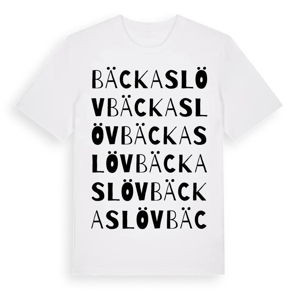 Bäckaslöv ordlek t-shirt är inspirerad av Bäckaslöv i Kronobergs län, Sverige. Tröjan är designad för dig som har en speciell koppling till platsen – oavsett om du bor här, har rötterna här eller bara älskar Bäckaslöv.
