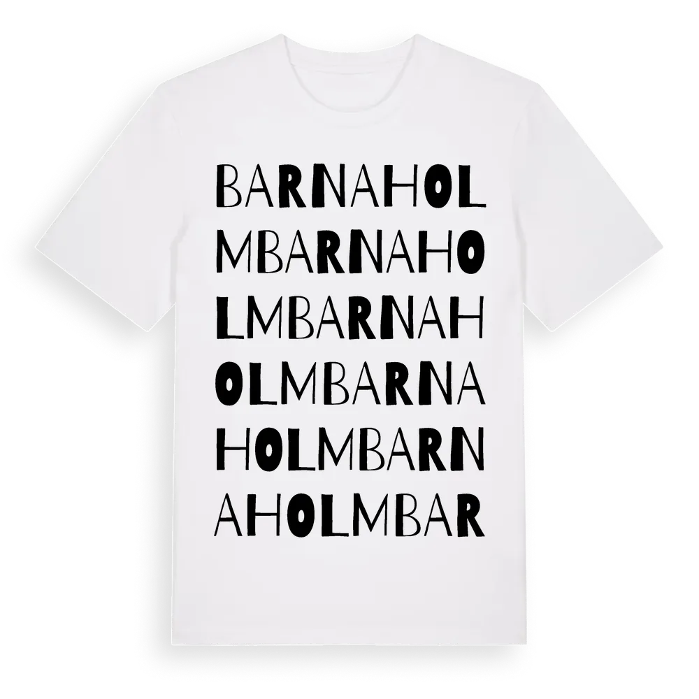 Barnaholm ordlek t-shirt är inspirerad av Barnaholm i Kronobergs län, Sverige. Tröjan är designad för dig som har en speciell koppling till platsen – oavsett om du bor här, har rötterna här eller bara älskar Barnaholm.