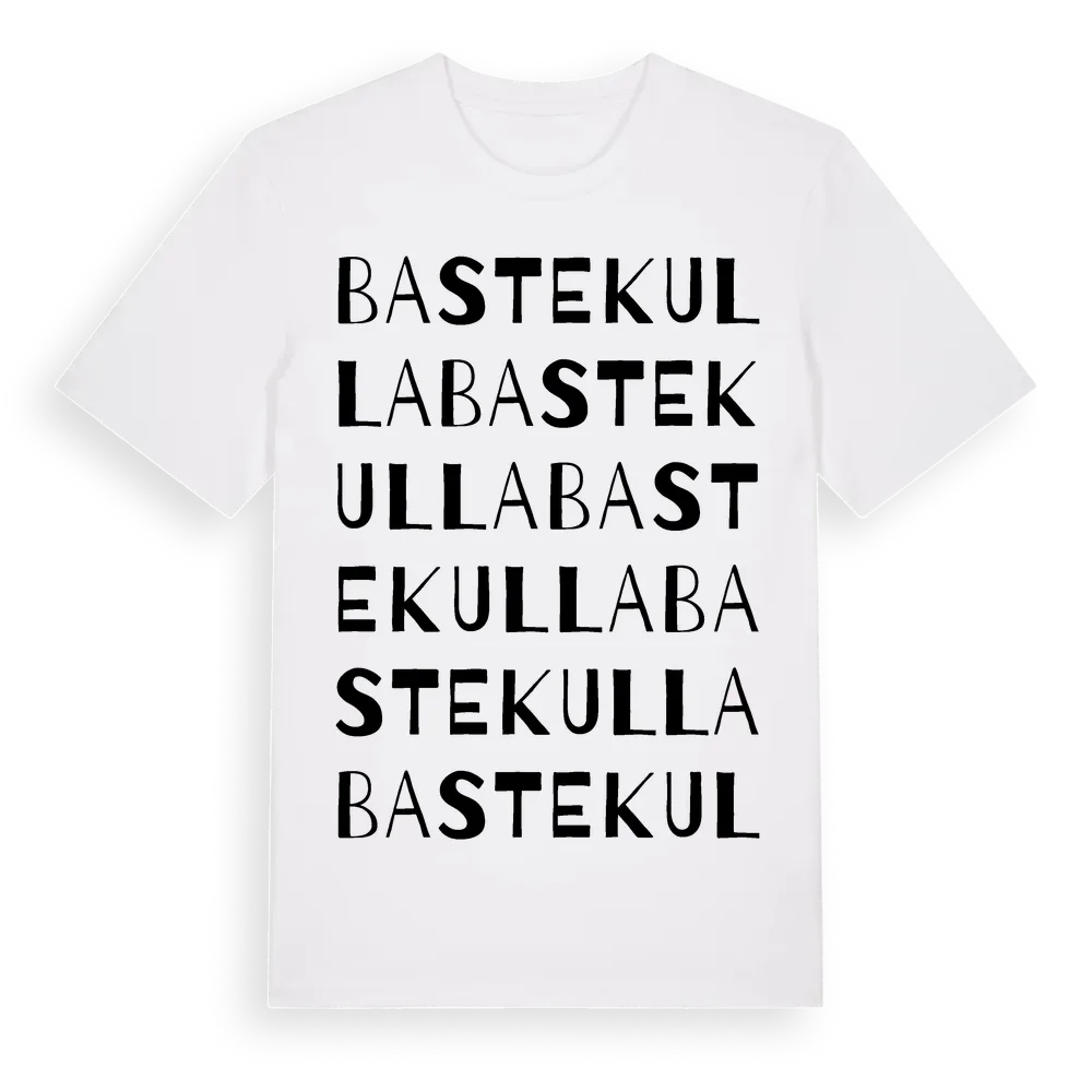 En ordlek byggd på Bastekullas namn. Subtilt och klurig – ett motiv som bara de som verkligen känner platsen fullt ut förstår. Premium bomull, unisex – från Bastekulla i Kronobergs län.
