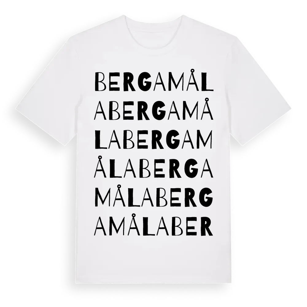 Bergamåla ordlek t-shirt är inspirerad av Bergamåla i Kronobergs län, Sverige. Tröjan är designad för dig som har en speciell koppling till platsen – oavsett om du bor här, har rötterna här eller bara älskar Bergamåla.