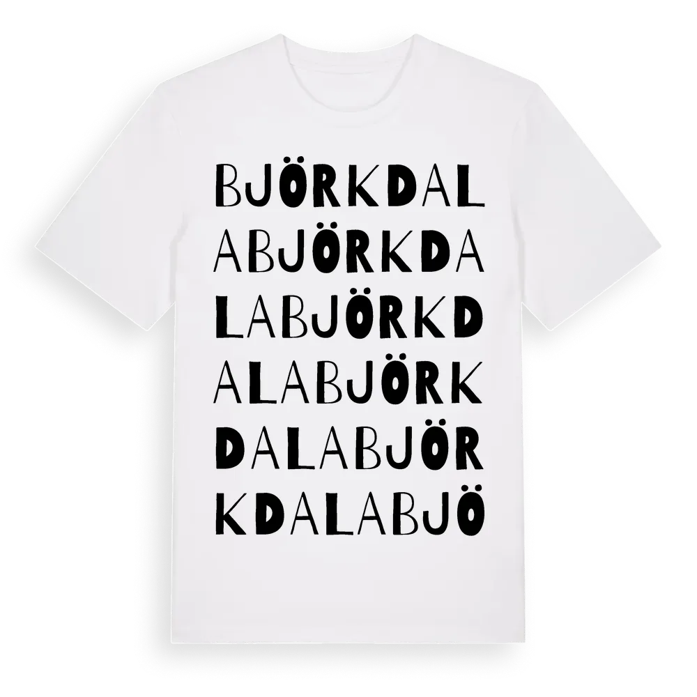 Björkdala ordlek t-shirt är inspirerad av Björkdala i Kronobergs län, Sverige. Tröjan är designad för dig som har en speciell koppling till platsen – oavsett om du bor här, har rötterna här eller bara älskar Björkdala.