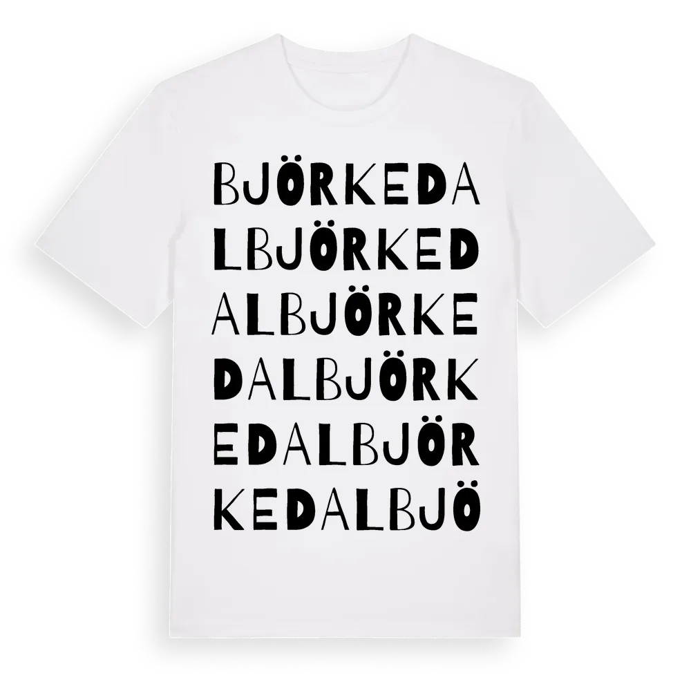 Björkedal ordlek t-shirt är inspirerad av Björkedal i Kronobergs län, Sverige. Tröjan är designad för dig som har en speciell koppling till platsen – oavsett om du bor här, har rötterna här eller bara älskar Björkedal.