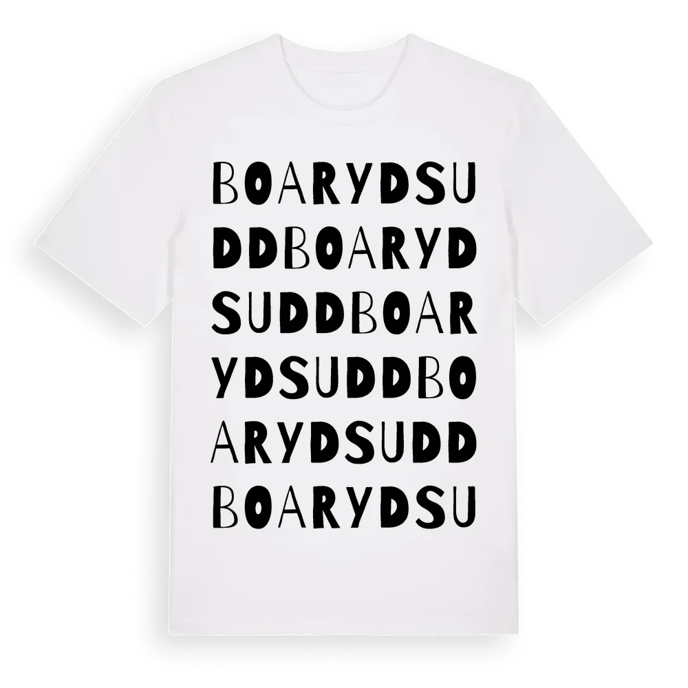 Boarydsudd ordlek t-shirt är inspirerad av byn Boarydsudd i Kronobergs län, Sverige. Tröjan är designad för dig som har en speciell koppling till platsen – oavsett om du bor här, har rötterna här eller bara älskar Boarydsudd.