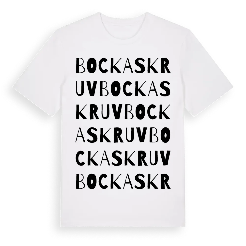 Bockaskruv ordlek t-shirt är inspirerad av byn Bockaskruv i Kronobergs län, Sverige. Tröjan är designad för dig som har en speciell koppling till platsen – oavsett om du bor här, har rötterna här eller bara älskar Bockaskruv.