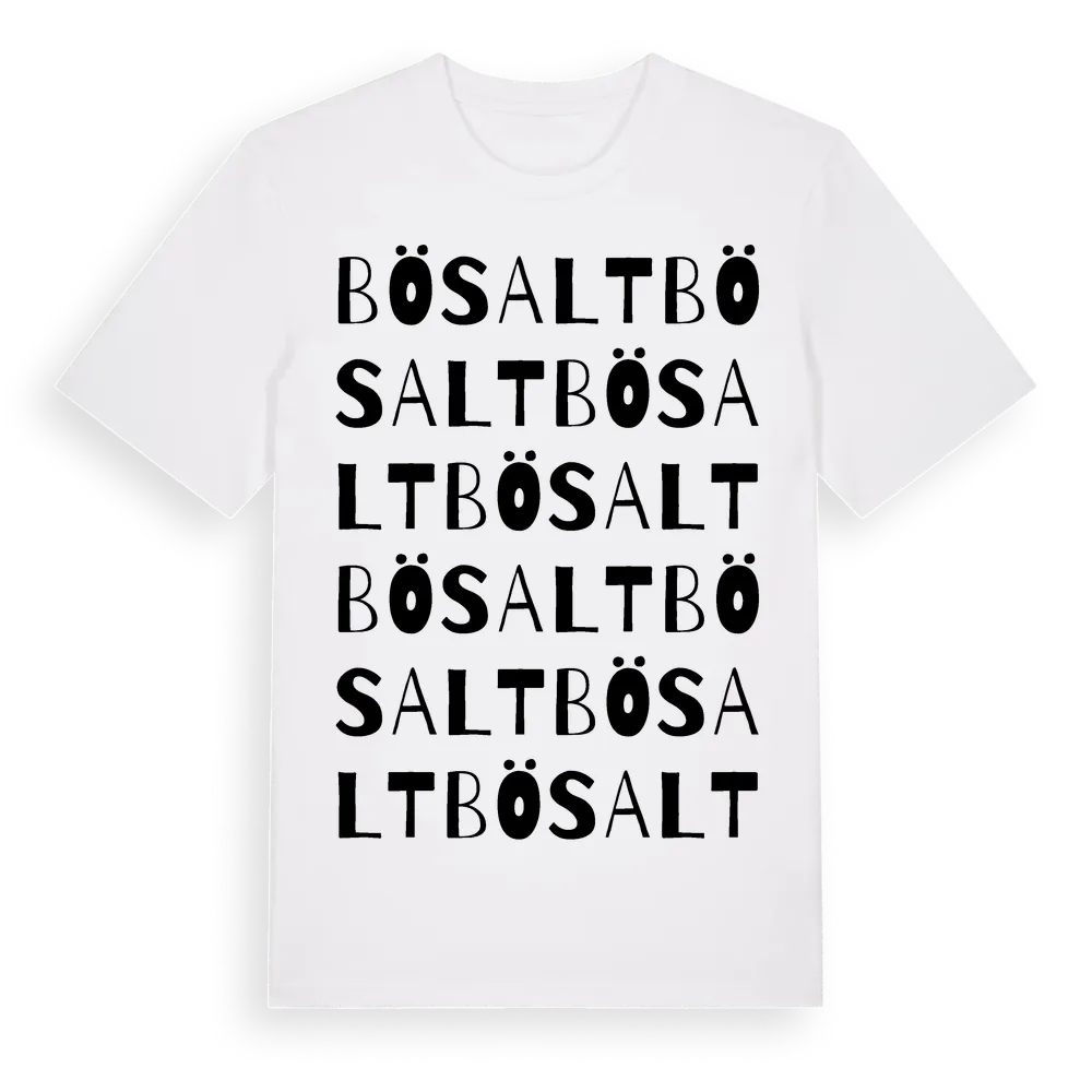 Bösalt ordlek t-shirt är inspirerad av byn Bösalt i Kronobergs län, Sverige. Tröjan är designad för dig som har en speciell koppling till platsen – oavsett om du bor här, har rötterna här eller bara älskar Bösalt.