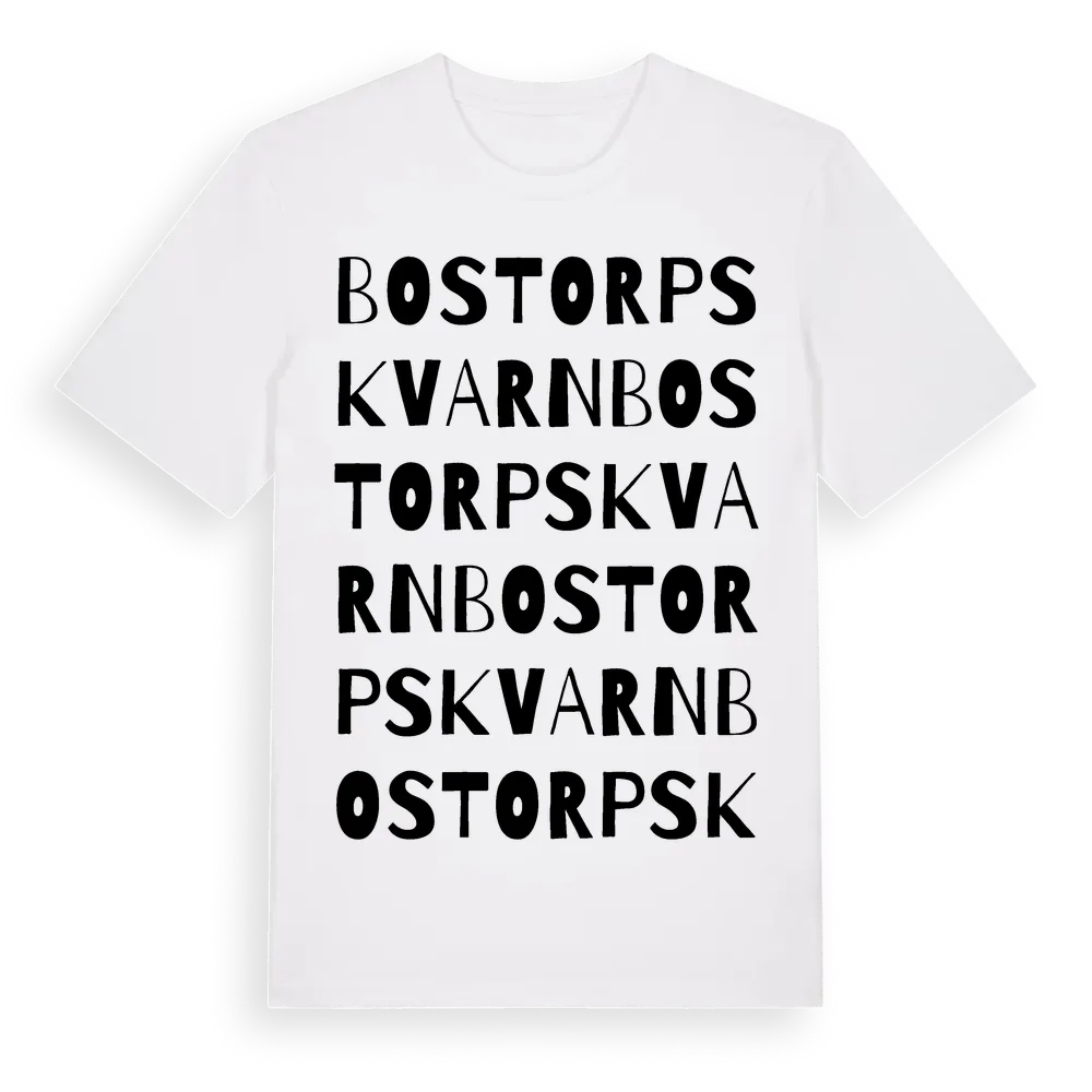Bostorps Kvarn ordlek t-shirt är inspirerad av Bostorps Kvarn i Kronobergs län, Sverige. Tröjan är designad för dig som har en speciell koppling till platsen – oavsett om du bor här, har rötterna här eller bara älskar Bostorps Kvarn.