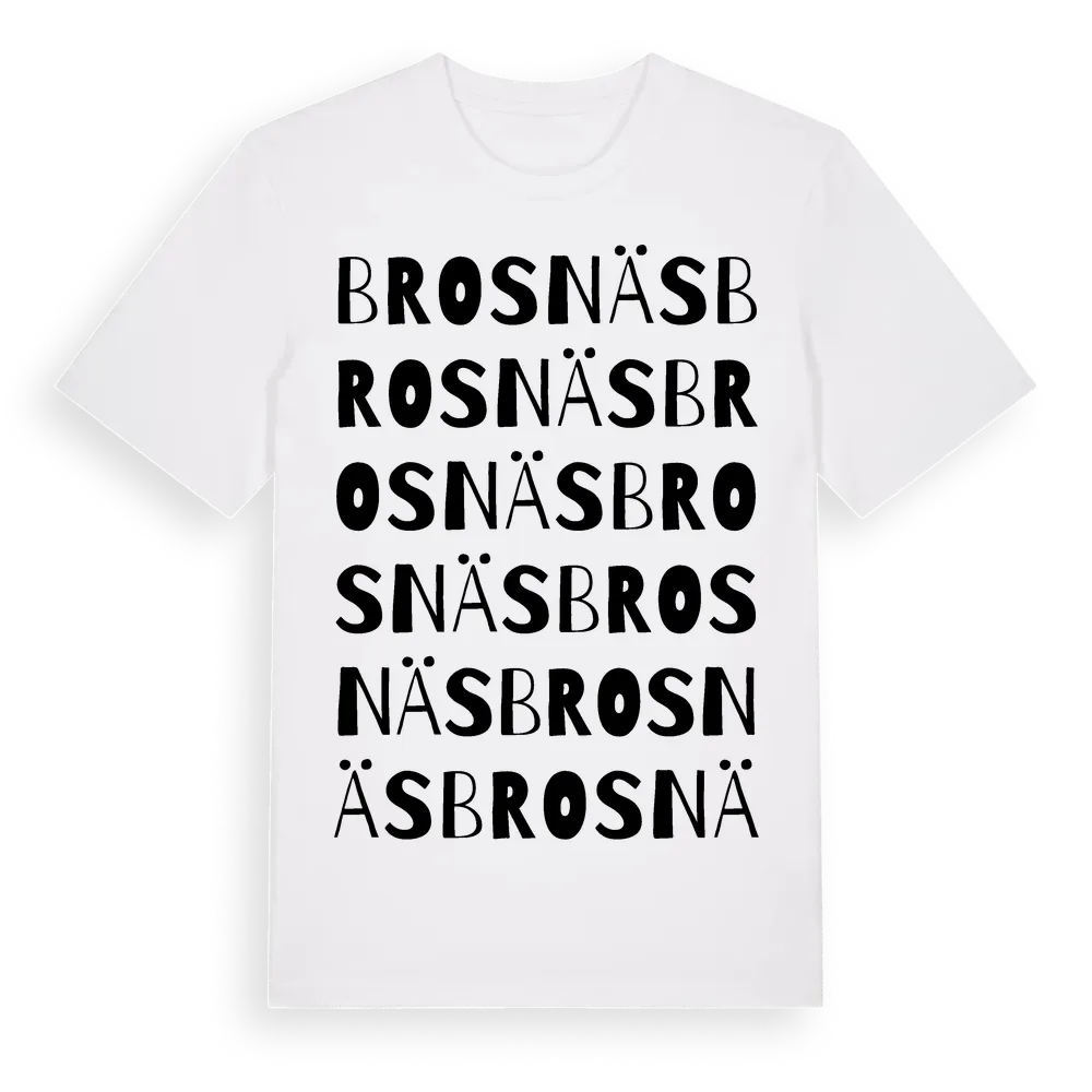 Brosnäs ordlek t-shirt är inspirerad av Brosnäs i Kronobergs län, Sverige. Tröjan är designad för dig som har en speciell koppling till platsen – oavsett om du bor här, har rötterna här eller bara älskar Brosnäs.