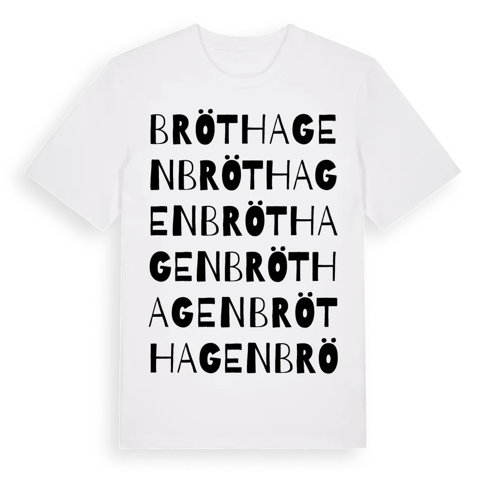 Bröthagen ordlek t-shirt är inspirerad av Bröthagen i Kronobergs län, Sverige. Tröjan är designad för dig som har en speciell koppling till platsen – oavsett om du bor här, har rötterna här eller bara älskar Bröthagen.