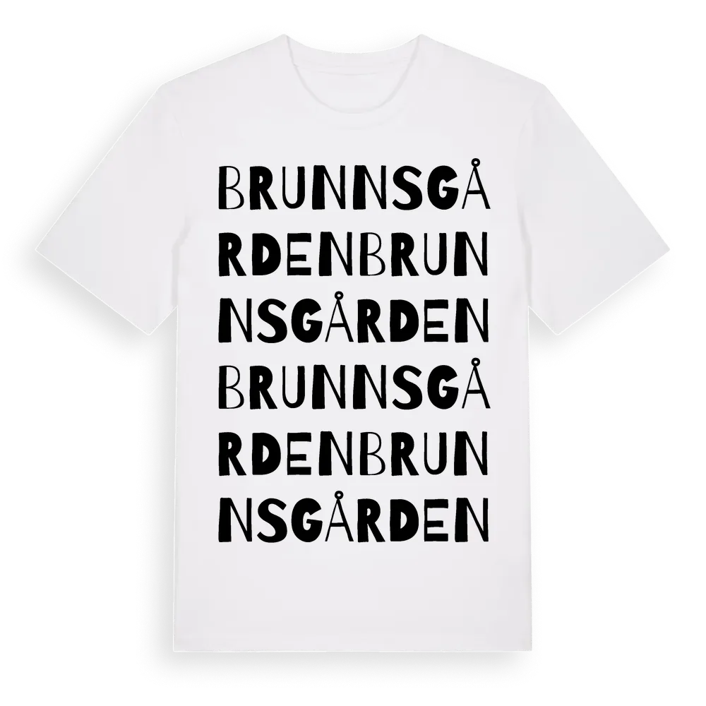 Brunnsgården ordlek t-shirt är inspirerad av stadsdelen Brunnsgården i Kronobergs län, Sverige. Tröjan är designad för dig som har en speciell koppling till platsen – oavsett om du bor här, har rötterna här eller bara älskar Brunnsgården.