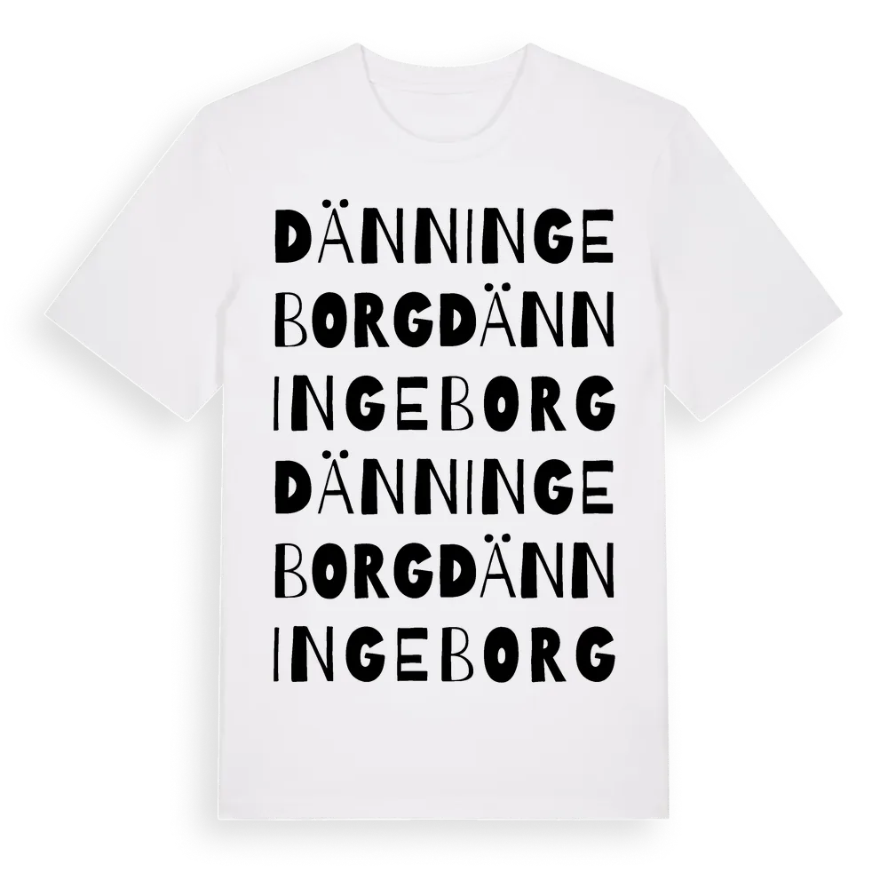 Dänningeborg ordlek t-shirt är inspirerad av Dänningeborg i Kronobergs län, Sverige. Tröjan är designad för dig som har en speciell koppling till platsen – oavsett om du bor här, har rötterna här eller bara älskar Dänningeborg.