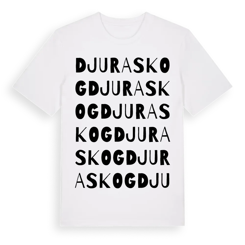 Djuraskog ordlek t-shirt är inspirerad av Djuraskog i Kronobergs län, Sverige. Tröjan är designad för dig som har en speciell koppling till platsen – oavsett om du bor här, har rötterna här eller bara älskar Djuraskog.