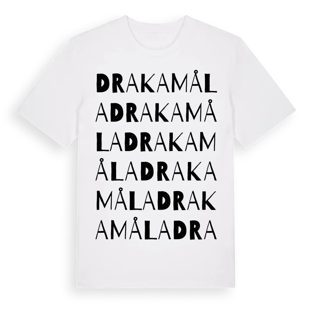 Drakamåla ordlek t-shirt är inspirerad av byn Drakamåla i Kronobergs län, Sverige. Tröjan är designad för dig som har en speciell koppling till platsen – oavsett om du bor här, har rötterna här eller bara älskar Drakamåla.