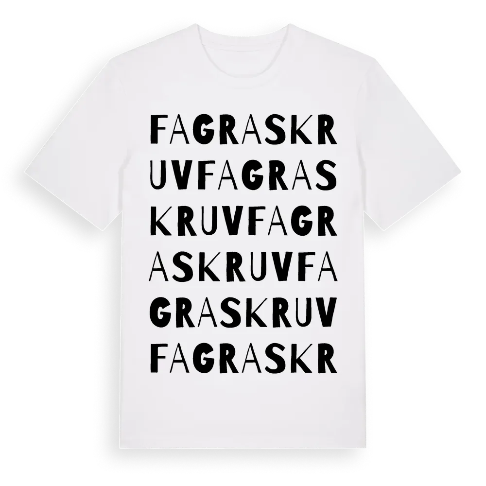 Fagraskruv ordlek t-shirt är inspirerad av byn Fagraskruv i Kronobergs län, Sverige. Tröjan är designad för dig som har en speciell koppling till platsen – oavsett om du bor här, har rötterna här eller bara älskar Fagraskruv.