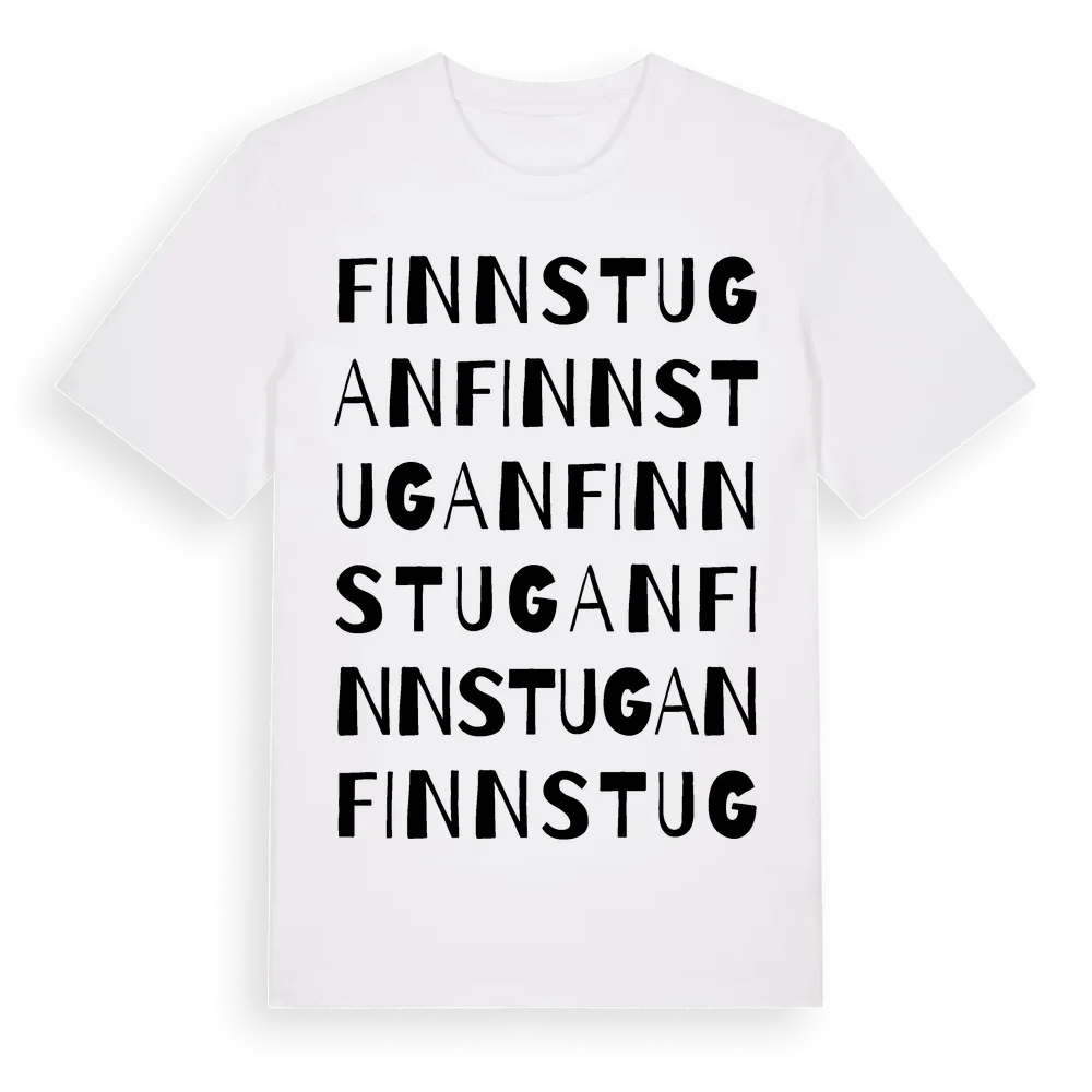 Finnstugan ordlek t-shirt är inspirerad av Finnstugan i Kronobergs län, Sverige. Tröjan är designad för dig som har en speciell koppling till platsen – oavsett om du bor här, har rötterna här eller bara älskar Finnstugan.
