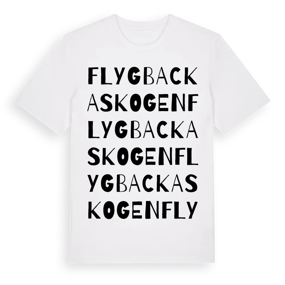 Flygbackaskogen ordlek t-shirt är inspirerad av Flygbackaskogen i Kronobergs län, Sverige. Tröjan är designad för dig som har en speciell koppling till platsen – oavsett om du bor här, har rötterna här eller bara älskar Flygbackaskogen.