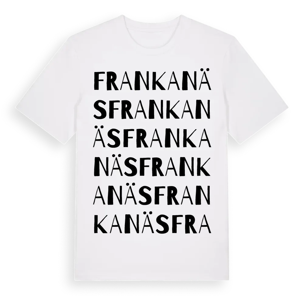 En ordlek byggd på Frankanäss namn. Subtilt och klurig – ett motiv som bara de som verkligen känner platsen fullt ut förstår. Premium bomull, unisex – från byn Frankanäs i Kronobergs län.
