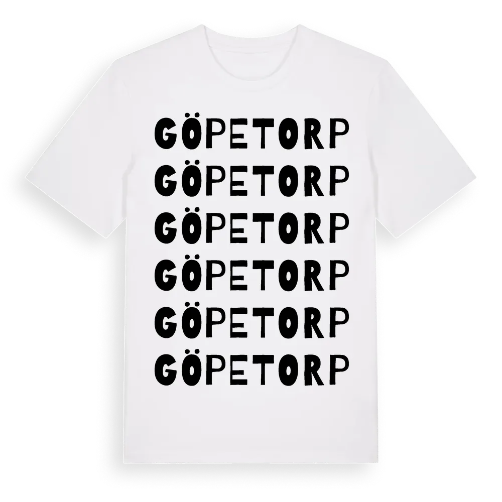 Göpetorp ordlek t-shirt är inspirerad av byn Göpetorp i Kronobergs län, Sverige. Tröjan är designad för dig som har en speciell koppling till platsen – oavsett om du bor här, har rötterna här eller bara älskar Göpetorp.